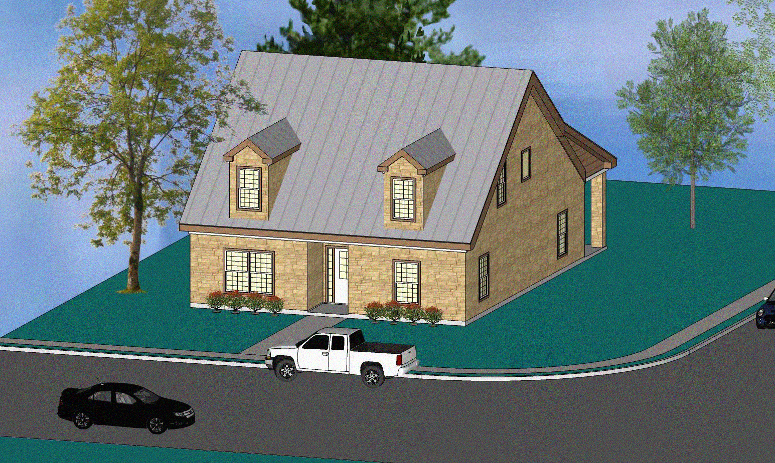 Le Maison differs little from the current floor plan, and has the same dimensions overall. Our modern version maintains the original large living room, bonus room, and kitchen in their original places, but adds a lavatory under the stairs and a formal dining room between living and kitchen. In place of the large closet and study of the original home, we’ve added a master bedroom suite, too. The upstairs of this charming cottage-like home features two additional bedrooms with ample closet space and the dormer windows present on the Felix Valle house originally, as well as a full bath and a surprising amount of bedroom space. In fact, there is room for a third full bedroom and bath upstairs! Finally, our modern version preserves the appearance of the stone masonry wall with a stone veneer and modern, Federal-style windows.