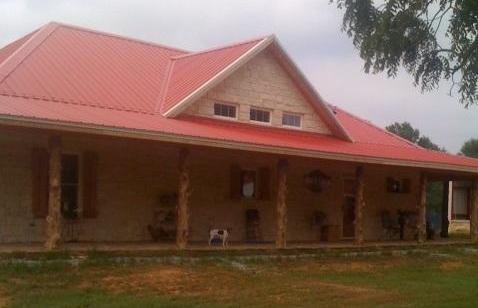 Another DAL Designs ranch house, this home is located near Centerville in Leon county. Designed for an older couple who wanted a quiet place to retire, the home features an Austin creme stone veneer, rustic standing-seam metal roofs, and wraparound porch – something of a Hill Country style home with French Colonial influence (the rough-cut cedar columns were all cut from trees already on the property). Inside, a large open living area, dining, and country-style kitchen lies below a true cathedral ceiling. Overall the house is 1,600 square feet of ADA-compliant living area plus 1700 square feet of covered porches and an attached three-car carport.